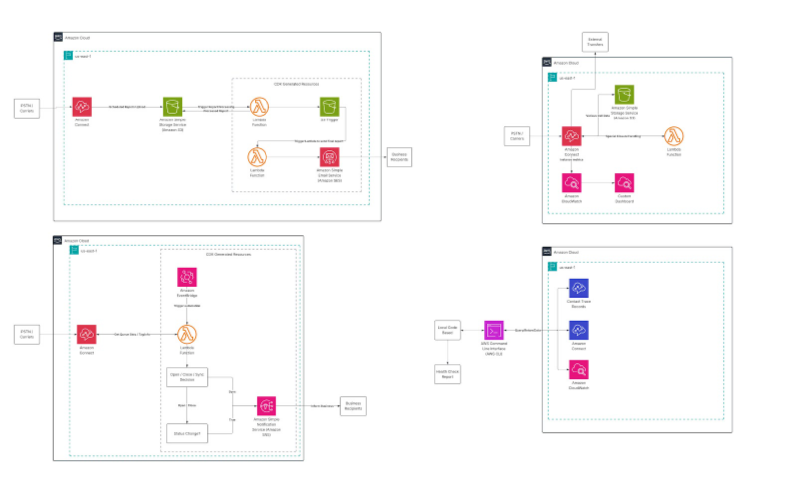 - Amazon SES & Amazon SNS: Multichannel report delivery and outbound campaigns via email and SMS.